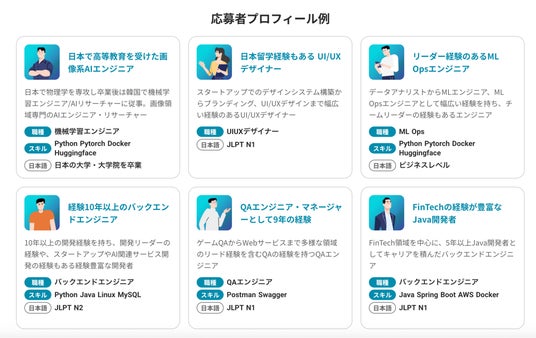 韓国のITエンジニアは、日本語習得率が高く、日系企業の勤務経験者や日本文化への親和性も高い人が多いと言われています。そのため、その他の外国人材と比べてカルチャーフィットを求める日本企業に適した人材を採用できる可能性が高いと言えます。これまでのクローズドβでのご提供期間では、AIエンジニアやUI/UXデザイナーなどの日本語もスキルも優れた方からの応募がありました。