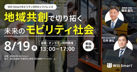 「移動」を支えるテクノロジー企業として地域交通インフラの課題解決に取り組む株式会社Will Smart(東京都江東区、代表取締役社長:石井康弘、以下 Will Smart)は、国土交通省「交通空白」解消・官民連携プラットフォーム協力のもと、2025年8月19日(火)に「Will Smart モビリティDXカンファレンス」を開催いたします。本イベントでは、静岡市長をはじめ、行政・交通・観光・金融など多様な分野の実務家・リーダーたちが集結。人口減少・高齢化に伴う交通課題に対し、ICTやデータを活用した社会実装の可能性を探ります。