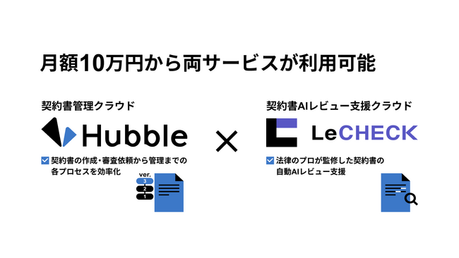 そうした状況を打破すべく、契約書管理を一元的に行える契約書管理クラウドサービス「Hubble」とAIレビュー支援をする契約書レビューAI支援クラウドサービス「LeCHECK」が連携し、月額10万円から両サービスをご利用いただくことで契約に関わる一連の業務を効率化していただきたいという思いで、アライアンス契約を締結しました。