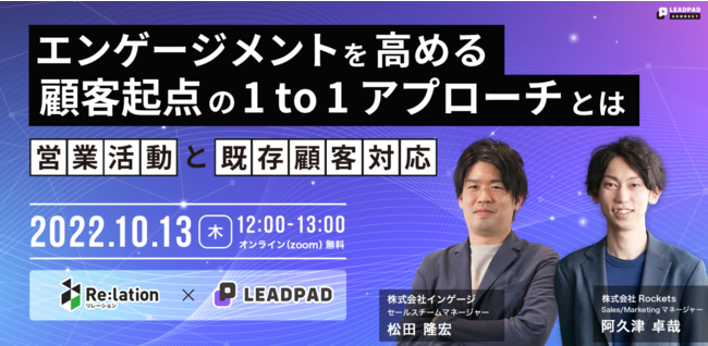 顧客に寄り添ったアプローチ、つまり「1to1アプローチ」が重要視されつつある昨今ですが、本セミナーでは、「商談獲得」までを担うセールスエンゲージメントプラットフォーム『LEADPAD(リードパッド)』を運営する株式会社Rockets、そして見込み顧客だけではなく、既存顧客への「問い合わせ自動化」を実現する『Re:lation(リレーション)』を運営する株式会社インゲージの2社で、営業活動~既存顧客対応まで、デジタルを活用して「顧客エンゲージメント」を高めていく重要性を徹底解説します!