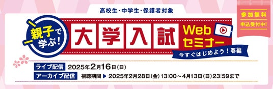学校法人河合塾は、新高1・2・3生・中学生とその保護者の方を対象に、双方向型のWebセミナーを2月16日(日)に開催します。