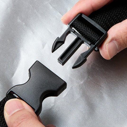 本体の裾にゴムが入っているため、車体にフィットしバタつきをおさえます。さらに、下部に付けたバックル付きベルトにより、風飛びを防ぎます。