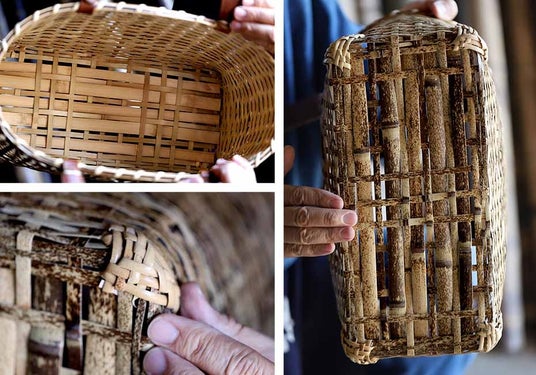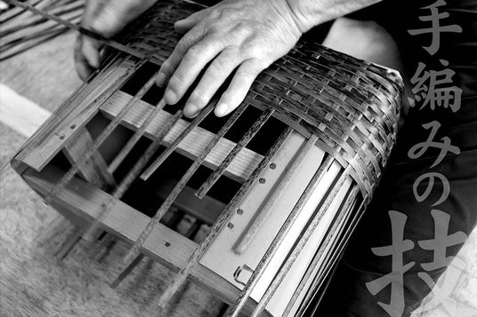 このバッグは、長年の経験を積んだ熟練職人たちの手で、ひとつひとつ丁寧に手作業で作られています。治具(型)を使用して安定した形状を実現し、竹ヒゴが折れないように水に浸しながら丁寧に編み上げます。底の角を熱した鉄棒で立ち上げる際には、職人の経験と繊細な感覚が不可欠です。細部まで心を込めて作られたこのバッグは、職人技の結晶とも言える逸品です。