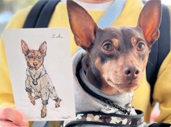 このたびの『ライブドローイング』は、愛犬の特徴を捉えた高いクオリティで注目されており、ペット業界でも大人気なイベントとなっており、お店へ遊びにいらしてくれたわんちゃんや、虹組のわんちゃんの写真をもとに、生き生きとした個性を表現していきます。生命観にあふれた線とやわらかな色合いが絶妙にマッチした画風で、愛犬の姿を似顔絵アートにのせて永遠に残すことができます。ドローイング後は、作品だけでなくメイキング映像もあわせてプレゼントいたします。