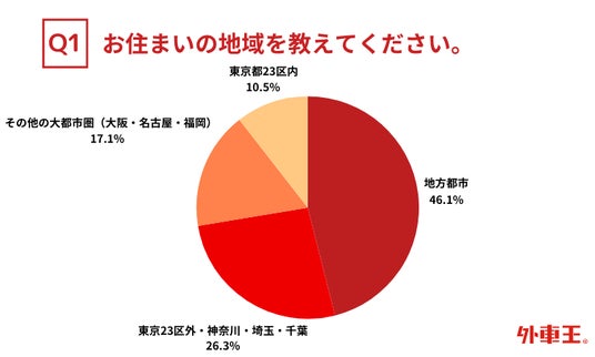 お住まいの地域を聞いてみたところ、最も多かったのは「地方都市」で46.1%、次いで「東京23区外・神奈川・埼玉・千葉」が26.3%、「大阪・名古屋・福岡などの大都市圏」が17.1%、「東京都23区内」が10.5%となりました。