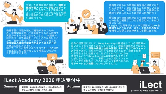 AI総合研究所として活動するNABLAS株式会社(本社 : 東京都文京区本郷、 代表取締役 所長 : 中山 浩太郎、 以下「当社」)が提供する実課題の解決を目的としたAI人材育成サービス iLect は、ディープラーニングの実践的スキル習得とE資格取得を目指す方向けの基礎講座「DL4E 2026 Summer & Autumn」の申し込み受付を開始いたしました。本講座は専門実践教育訓練給付制度の対象であり、要件を満たすことで受講料の最大80%が支給されます。