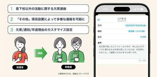 「欠席連絡カスタマイズ機能」によって、「部活動やプールなど、登下校以外の活動に関する連絡」や「欠席・遅刻・早退以外の「その他」連絡の受付」など学校ごとに欠席連絡の項目や内容を柔軟に設定することが可能になります。