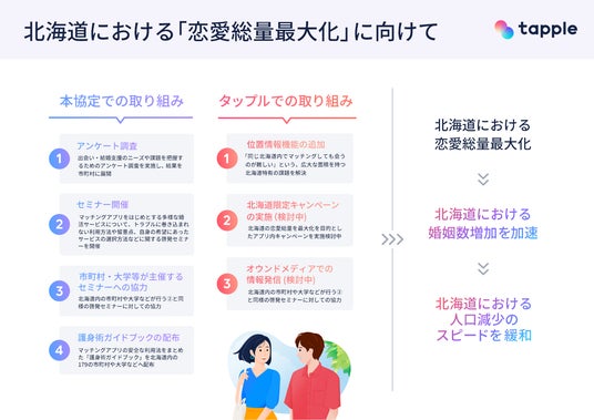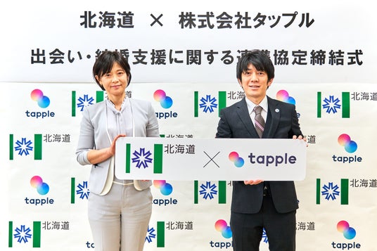 株式会社タップル(本社:東京都渋谷区、代表取締役社長:平松繁和)は結婚を希望する人の多様なニーズに応じた出会い・結婚支援に取り組むことを目的に、北海道(知事:鈴木直道)と「出会い・結婚支援に関する連携協定」を締結いたしました。「タップル」の恋活・婚活に関する知見やサービス特性を活かすことで、北海道での出会い・結婚支援の取り組みを実施いたします。