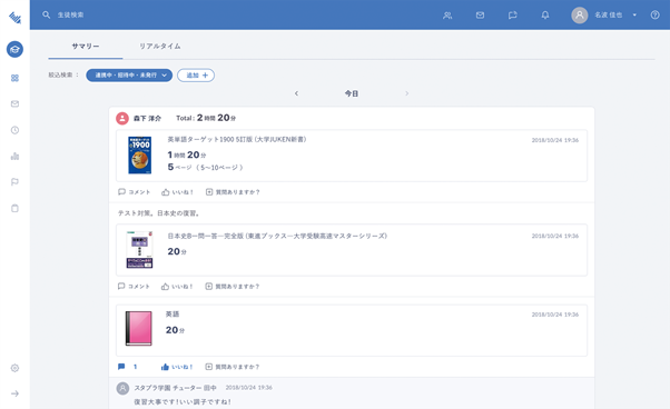 生徒一人ひとりにつく各コースの担任は、可視化された学習ログを元に、生徒一人ひとりに合わせた指導が可能となりました。また、実際に「Studyplus」を日々活用する生徒からも、「学習ログが付けやすい」「先生からタイムリーにフィードバック・反応がもらえて嬉しい」と喜びの声を多数いただいています。