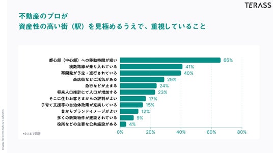 不動産のプロ100名へのアンケートでは、「都心部(中心部)への移動時間が短い」や「複数路線が乗り入れている」といった勤務地が集中する都心へのアクセスの良さが最も重視されていました。