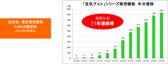 「豆乳グルト」シリーズは、2010 年 4 月の発売から 11 年連続で伸長しております。