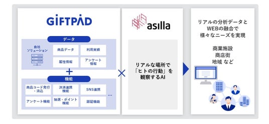 1.商業施設や複合施設などへの導入実績のあるアジラ様と、WEB上のサービスで様々なデータを保有するギフトパッドが連携することにより、リアルとWEBの両方において効果測定が可能になります。