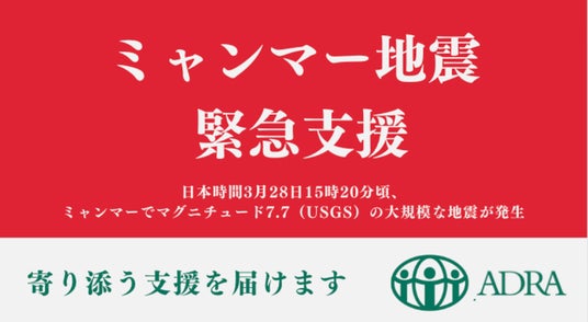日本時間28日15時20分頃、ミャンマーでマグニチュード7.7(USGS)の大規模な地震が発生しました。この地震により、人的被害や建物倒壊などの甚大な被害が報告されております。認定NPO法人 ADRA Japan(アドラ・ジャパン|所在地:東京都渋谷区神宮前1-11-1 理事長:柴田俊生)は即座に、状況の状況確認を開始し、被災された方に寄り添う緊急支援を届ける準備を進めています。被害の全容が明らかになるまでにはまだ時間がかかると思いますが、必要な支援を迅速に届けることができるよう、緊急募金を開始します。