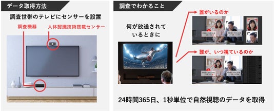 REVISIOが独自開発した人体認識センサーを一般家庭のテレビの上に設置し、調査参加者の視聴態勢を毎秒で自動的に取得しています。これによりテレビの前にいる個人を特定し、その人がテレビ画面に目線を向けているかがわかります。