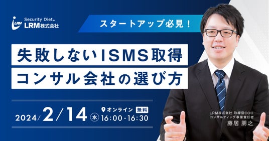 LRM株式会社(以下LRM、本社:兵庫県神戸市、代表取締役CEO:幸松哲也)は、2024年2月14日(水)に「スタートアップ必見!失敗しないISMS取得コンサル会社の選び方」のオンラインセミナーを開催いたします。