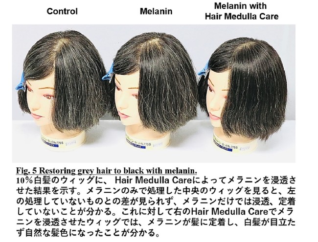 「Hair Medulla Care」によって白髪にメラニンを浸透させる試験を行ったところ、白髪が明らかにメラニンで着色され、10%白髪のウィッグでは白髪の存在が顕著に目立たなくなりました。(図3)