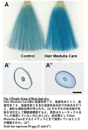 当社の化粧品研究開発センターは、塩基性色素をメデュラにまで届け、毛髪全体を美しい色調に染めること、またこれまで不可能であったメラニンを毛髪に浸透させることを成功させました。その高い浸透力によってまだまだ可能性を秘めている「Hair Medulla Care」ですが、今回の研究結果により、これまで不可能であった新たな毛髪ケアの可能性を示しました。