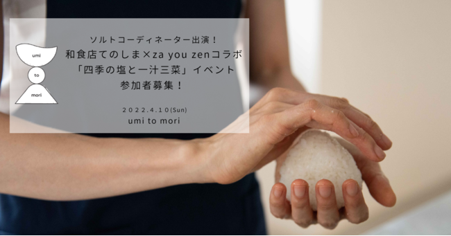株式会社 JIMOS(東京本社: 新宿区、代表取締役社長: 川上裕也)は、za you zen 四季の塩からはじまるライフコンセプトショップ「umi to mori」で、ソルトコーディネーターの青山志穂さんをゲストに、和食店「てのしま」とコラボイベントを開催、参加者を募集します。