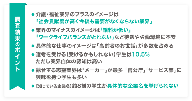 当調査では23卒~26卒学生を対象として、介護・福祉業界における仕事のイメージ、介護・福祉業界以外に志望している業界、介護・福祉業界で思い浮かべる企業名などを聞き、データにまとめました。