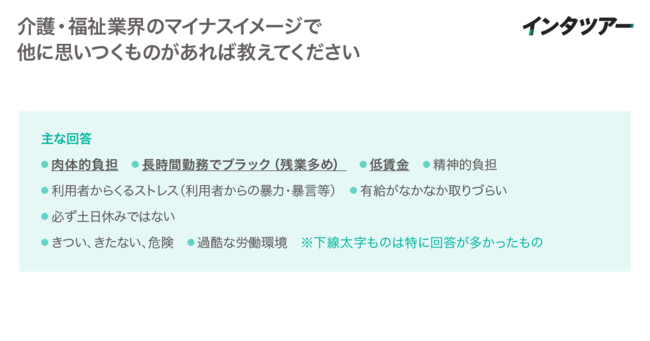 設問4. 介護・福祉業界のマイナスイメージで他に思いつくものがあれば教えてください(自由記述)
