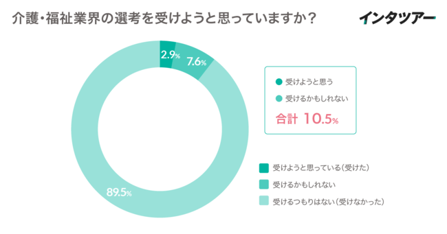 介護・福祉業界の選考を「受けようと思う(受けた)」「受けるかもしれない」と回答した学生は10.5%で、残りの89.5%が「受けるつもりはない(受けなかった)」と回答しています。不人気業界の一つと言われる介護・福祉業界ですが、社会貢献度の高さは認知されているものの、そこで働こうという動機づけがされていない、または弱いことが改めて浮き彫りになったと言えるでしょう。