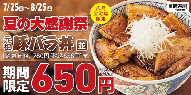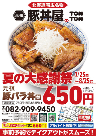ボリュームたっぷりの北海道・帯広豚丼が人気の「元祖豚丼屋TONTON 広島宝町店」(住所:広島県広島市中区宝町6-30、TEL:082-909-9450)で、7月25日(火)~8月25日(金)の期間中“夏の大感謝祭”を実施、「豚バラ丼【並】」を期間限定価格650円(税込715円)で提供いたします。
