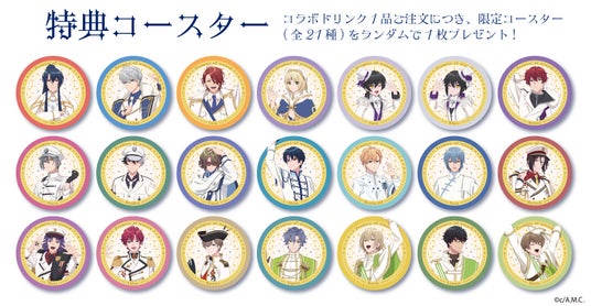ドリンクを1杯ご購入いただくと、コラボ限定コースター(全21種)をランダムで1枚プレゼントいたします。
