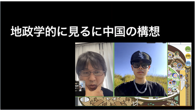 通信制高校らしく、オンラインでキャンプ場からプレゼンをしてくれたのは、地政学で独自の学びを深めているT・A君。プレゼンテーマに選んだのは「中国」です。なぜ中国が尖閣諸島を自国の領土であると主張しているのか、「シーパワー」をキーワードに解説を展開しました。日本で有事が起こる可能性を地政学的な側面から語り、「海洋国家である日本はシーレーンをしっかりと確保し輸送や物資を安定させないといけない。有事が起きないようにするために、皆さんにも地政学や日本近辺の世界情勢を少しでも知ってほしい」と呼びかけました。
