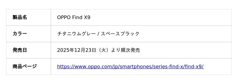 革新的なデザインとテクノロジーで業界をリードするスマートデバイスブランドOPPOは、OPPOのハイエンドスマートフォン、Find Xシリーズの最新機種「OPPO Find X9」(オッポ ファインド エックスナイン)を一部の販売チャネルにて、12月23日(火)より順次販売を開始します。(販売開始日、販売価格は取扱い各社にお問い合わせください。)