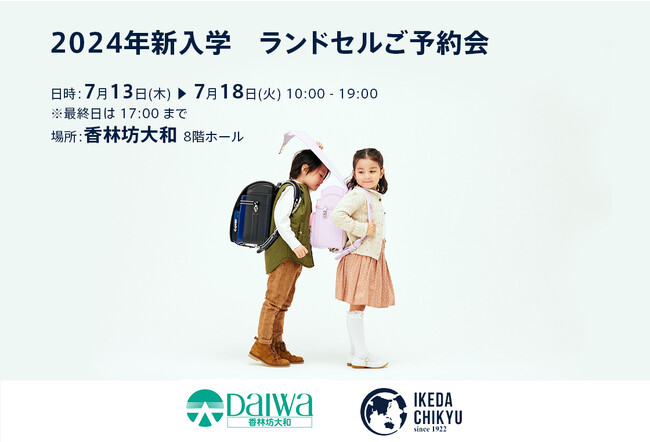 ランドセルの企画・販売を行う池田地球株式会社(本店:東京都港区:代表取締役 村尾光一)は、7/13(木)~7/18(火) の期間、香林坊大和 8階ホールにて開催される「2024年新入学 ランドセルご予約会」に参加いたします。