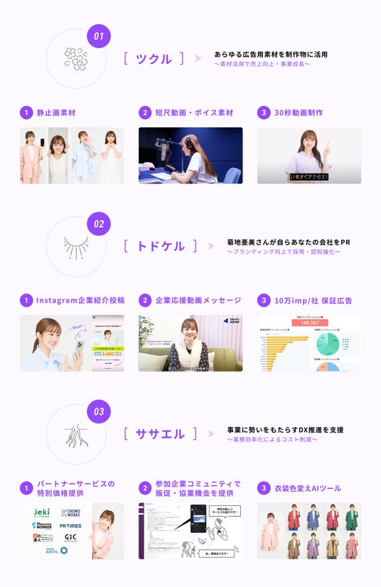 具体的には、地方出身のタレントの静止画/動画素材(ツクル)、タレントによるSNSでの告知や応援動画メッセージ(トドケル)、各パートナー企業によるサービス優待(ササエル)といった、さまざまなサポートがセットになった、革新的なプランです。