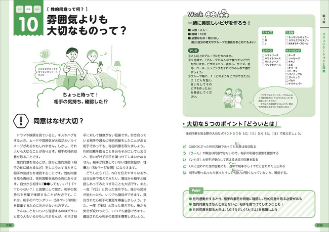基本的な知識からトラブル、法律に関する情報まで、周りの人とのコミュニケーションを中心に、イラストつきでわかりやすく解説しています。より自分ごととして考えやすいように、自分で考えたり、ほかの人と話すきっかけを作れるワークを用意しました。ぜひグループやクラスでワークに取り組んでみてください。