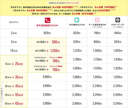 ※1 「容量アップ!割引アップ!キャンペーン」および「ハッピープライスキャンペーン」を併用した場合の最大特典内容です。 「15ギガプラン先行特典」は、2月28日までに利用開始した場合に限り2月ご利用分の割引額を200円増額(15ギガプランのみ)いたします。