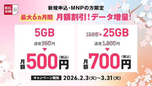 動画視聴やオンラインゲーム、SNS の普及により、スマートフォンのデータ通信量は年々増加傾向にあります。 ビックカメラグループが提供する「BIC SIM powered by IIJ(以下、BIC SIM)」は、こうした大容量データ通信のニーズにお応えし、より多くのお客様に快適な通信環境を提供するため、2026年3月1日より「ギガプラン」の15ギガプランの音声SIM・音声eSIMの月額料金を従来の1,800円(税込)から1,600円(税込)へ値下げいたします。進学や就職などでライフスタイルが変化する春の新生活シーズンに向け、通信費を抑えつつデータをたっぷり使いたいお客様をいち早くサポートいたします。