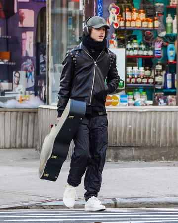 ティモシー・シャラメが、ニューヨークにて2023年春夏プレコレクションよりシルバーメタルアイレットのディテールが特徴的なフロントジップのレザージャケットを着用。