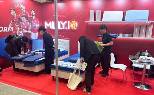 エムリリーのブースでは、現在展開中の優反発マットレスを設置。今回ギフトショーにお越しいただいた来場者の方々に実際に触ってもらいながらエムリリシリーズの寝具の感触を体験していただきました。寝具はしっかりと感触を確かめる機会が少ないため、スタッフの解説にも力が入ります。