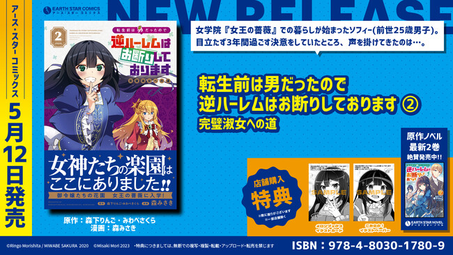 アース・スターノベルで刊行中のノベルが原作で、現在コミック アース・スターで掲載中の人気作品『転生前は男だったので逆ハーレムはお断りしております 完璧淑女への道』(原作:森下りんご・みわべさくら 漫画:森みさき)第2巻を5月12日(金)に発売いたします。