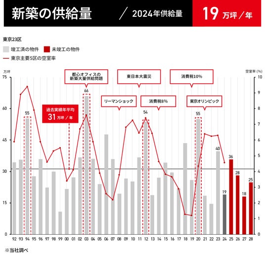 2024年の東京主要5区オフィスビル新規供給量は約19万坪であり、供給が多かった2023年の約40万坪の半分程度の供給となった。2023年に竣工した物件の空室解消が順調に進み、2024年に竣工した物件についても堅調に埋まっていたことで、マーケットは回復傾向となった。なお、新築物件に関しては、働き方改革関連法の影響により、工期が伸びて竣工が後ろ倒しになっている物件も出てきており、2025年以降の竣工予定物件への影響も懸念される。