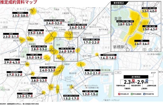 なお、成約賃料についてもほぼすべてのエリアで上昇しており、マーケットの回復が色濃く反映されたといえる。下記マップに、2024年12月末時点における各エリアの推定成約賃料を示す。