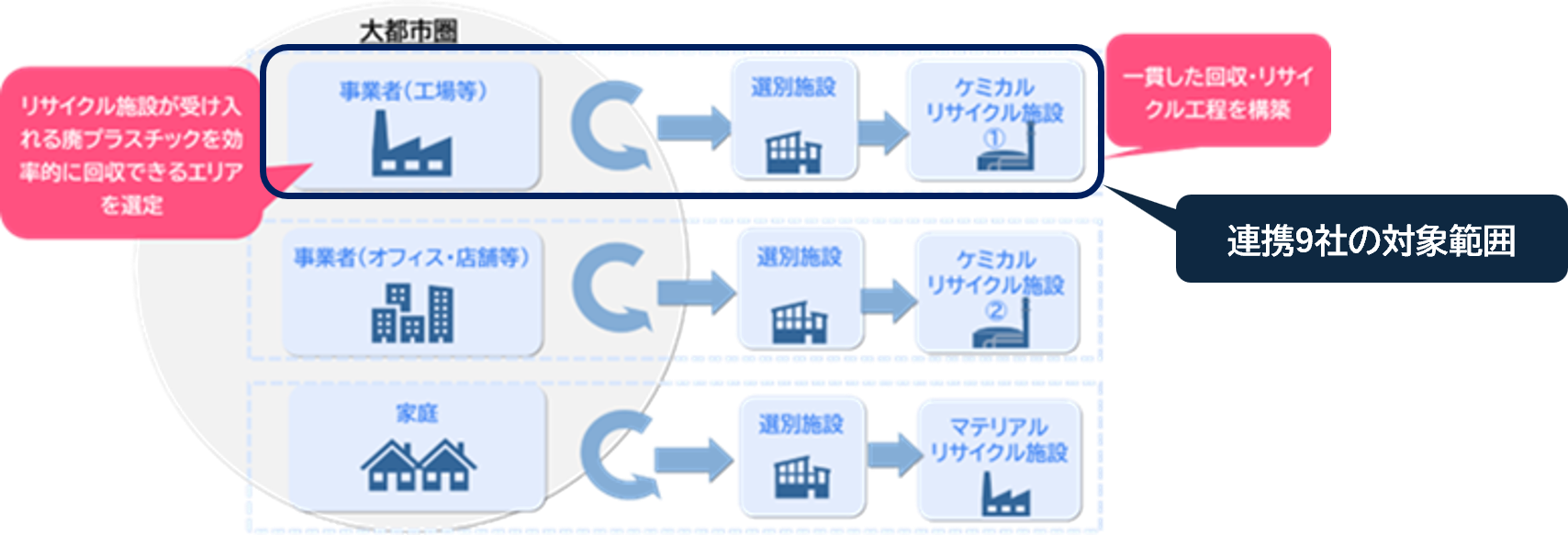 本実証事業のうち、連携9社は、「大都市圏」において、工場から排出される廃プラスチックを対象に、分別・回収からケミカルリサイクル、再生材製造に至るまでの一貫したサプライチェーンの実証を行います。各社の専門領域を活かし、大都市圏における効率的かつ高品質な資源循環モデルの構築を目指します。各社の主な役割は以下の通りです。