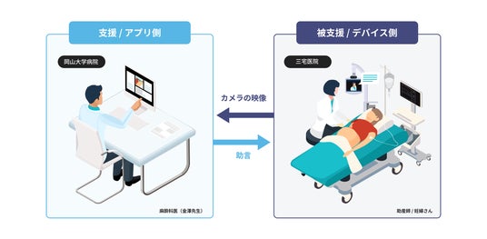 専門医の少ない医療機関と遠隔地の専門医をオンラインで繋げる、リモート操作可能なリアルタイム遠隔医療システムです。超音波診断装置などの周辺医療機器と接続し、患者さんの容体を短時間で把握することができます。遠隔地にいる医師主導で操作を可能とし、現場にいるように情報を取得できます。