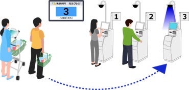 3. セルフレジ空きレジ案内システム画像認識AIがPOSシステムの状況とカメラ映像を解析することでセルフレジの空き状況を把握し、レジ待ちをしている消費者へ空きレジを自動で案内するシステムです。2025年9月に発売しました。繁忙時間帯のレジ案内をシステム化することで、レジ案内業務が必要な店舗では、1週間で40人時(*1)の案内業務削減が可能となります。