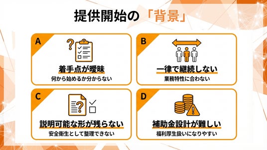 - 安全衛生の取り組みとして説明可能な形(目的、専門家関与、継続性、効果検証)が残らない