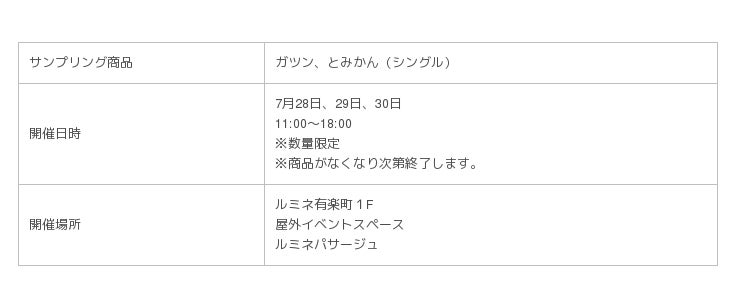 赤城乳業株式会社(本社:埼玉県深谷市、社長:井上創太)は2017年7月28日(金)~30日(日)の三日間、ルミネ有楽町1F屋外イベントスペース ルミネパサージュ にて夏にぴったりなアイス「ガツン、とみかん」の無料配布を実施いたします。