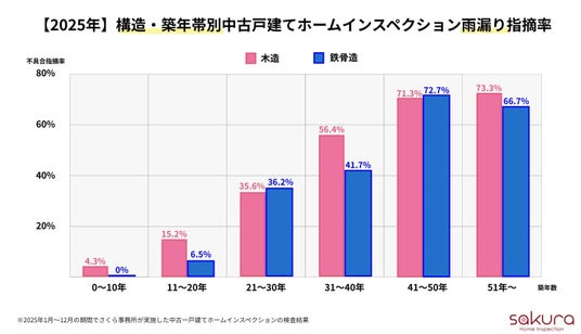 2025年に当社が実施した中古戸建てホームインスペクションのうち、構造・築年帯別の雨漏り指摘率