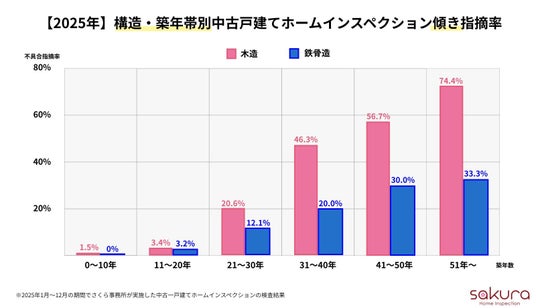個人向け総合不動産コンサルティング・ホームインスペクション(住宅診断)、マンション管理組合向けコンサルティングを行う“不動産の達人 株式会社さくら事務所”(東京都渋谷区/社長:山本直彌)は、2025年にさくら事務所が実施した中古戸建てホームインスペクションにおける主要5項目の不具合指摘率を集計いたしましたのでご報告いたします。