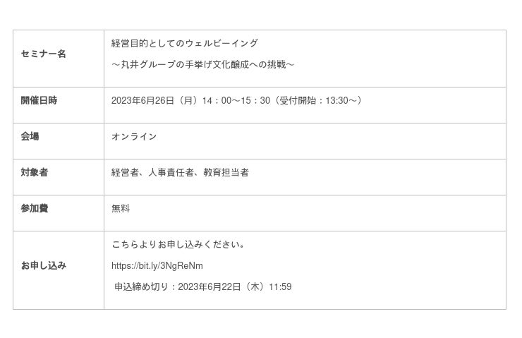 本講演では、実際に推進役として取り組まれている取締役上席執行役員の小島氏より、丸井グループがどのようにしてウェルビーイング経営を定義し、取り組み、効果を上げてきたか、具体的事例を交えてご紹介いただきます。