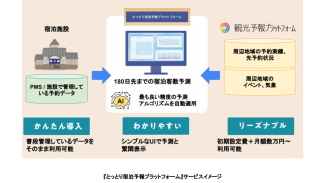 『とっとり宿泊予報プラットフォーム』は、宿泊施設が保有するPMS等の宿泊データと『観光予報プラットフォーム』に蓄積された地域データ等をもとに、AIによって宿泊者数を180日先まで予測するサービスです。