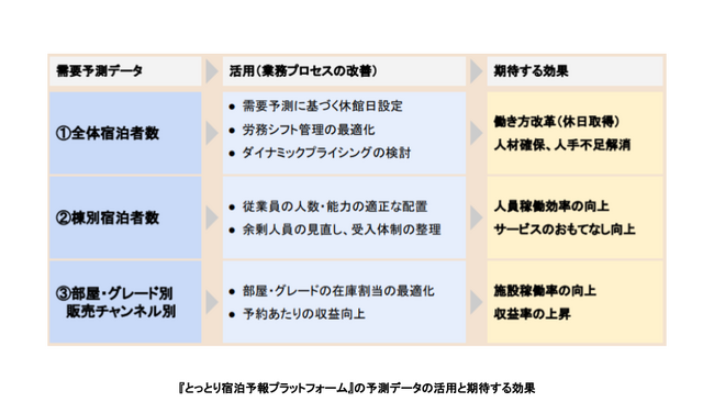 『とっとり宿泊予報プラットフォーム』がご提供する予測データを自館の様々な施策に活用することで、データに基づいた客観的で効率的な施設運営が可能となり、生産性向上と収益UPを図っていくことが期待できます。