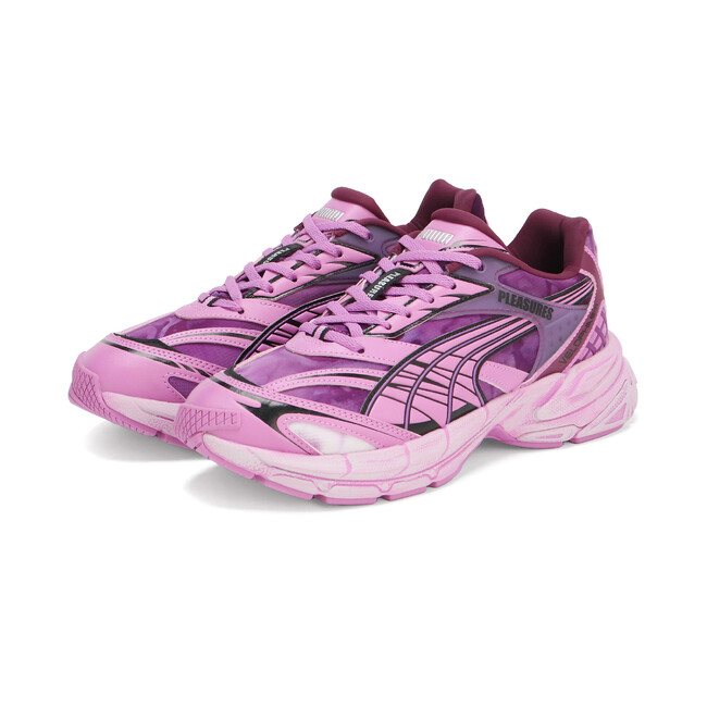コラボレーションモデル「VELOPHASIS OVERDYED PLEASURES(ベロファシス オーバーダイ プレジャーズ)」は、斬新なシェイプにテクニカルな 素材とパフォーマンス素材を組み合わせています。また、シューレースからソールまで施した全面パープルのオーバーダイ(後染め)加工により、 カスタマイズされたような雰囲気が特徴的です。ソールのカラーリングは、独特の方法で施され、履き古したような風合いに仕上げています。ま た、アッパーには、パープルに染められた半透明のパーツが施され、ブラックで“PLEASURES”のロゴが刻印されています。